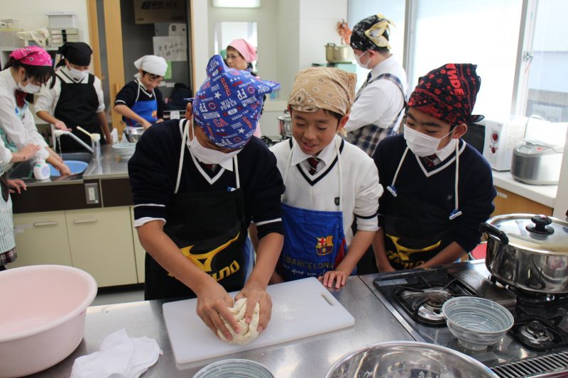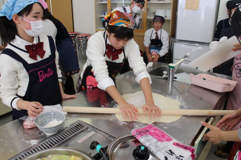 おぼつかない包丁さばきと力加減がとても難しいうどんの打ち方を、食生活推進委員の方から手取り足取り教授され、それぞれの班で個性あふれる一品が完成しました。