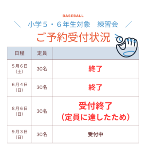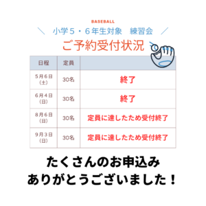 8月6日(日)に実施いたします第3回 中学野球部練習会ですが、参加者数が定員に達したため受付を終了いたしました。 多数の...