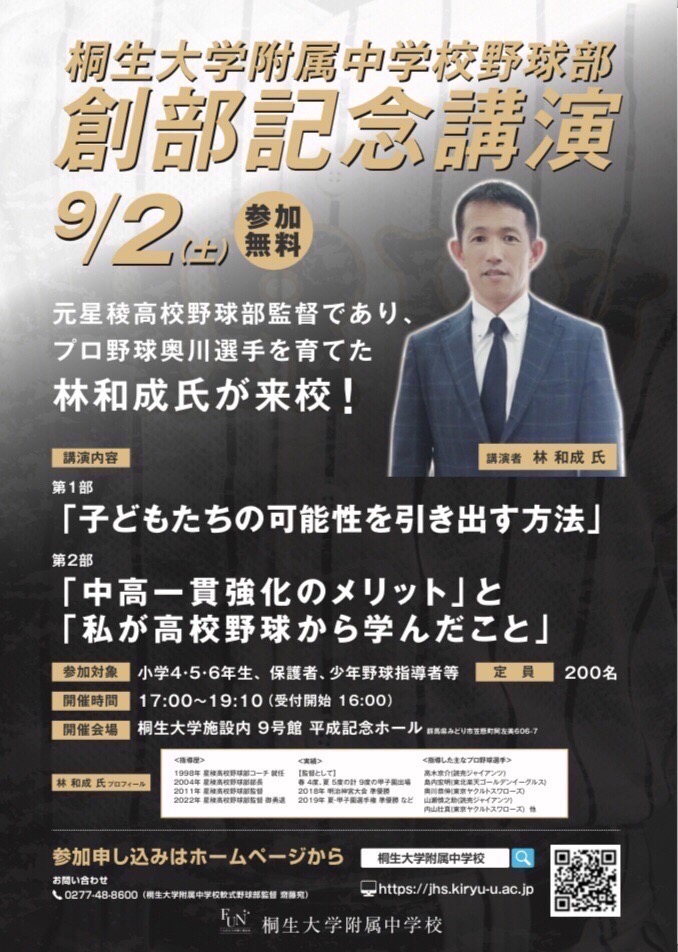 みなさん こんにちは! この度、『桐生第一中学校野球部創部記念講演会』を 開催することが決定いたしました! お招きするの...