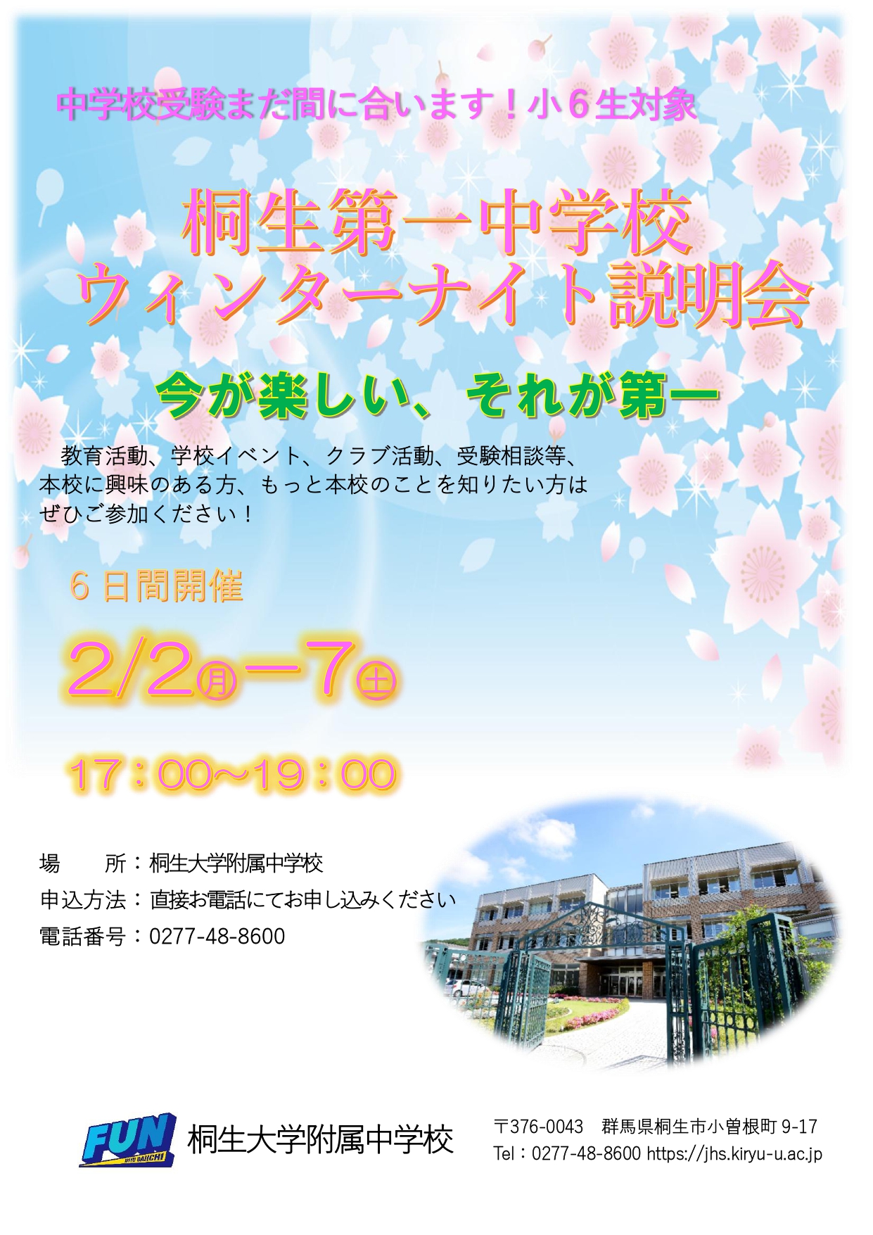 【中学受験まだ間に合います!小6対象 桐生第一中学校ウィンターナイト説明会】を 下記の期間で実施します。 ウィンターナイ...