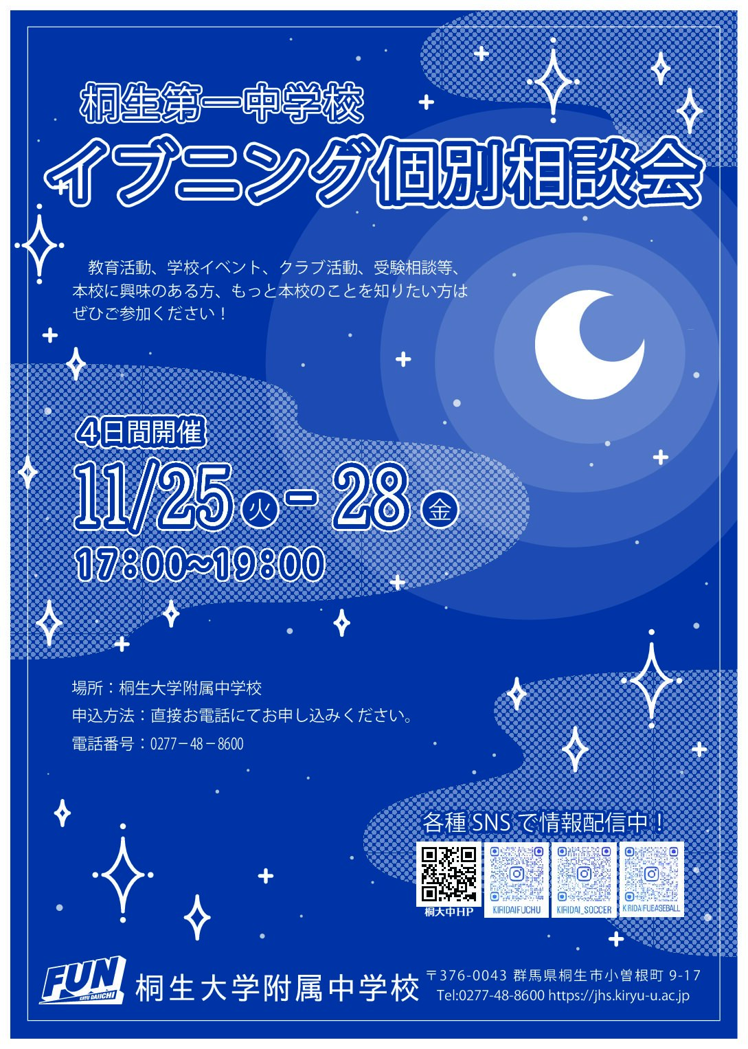 【イブニング個別相談会】を下記の期間で実施します。 イブニング個別相談会 本校の基本ビジョン・教育システム・教育の柱・入...