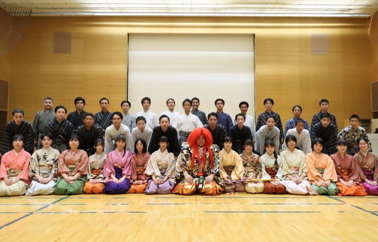 観世流下平克宏先生に授業をしていただいています。能の独特は謡いや仕舞を基本から学びます。2・3年生対象。2年生は謡いを中心に、3年生は仕舞を完成させます。他に、能の面を付けたり、衣装を実際に着る授業もあります。