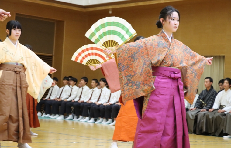 毎年11月に発表会を開催。1・2年生は「箏」の演奏、3年生の「能」の舞を披露します。生徒たちは練習の成果をしっかり発表します。歴史や感想を英語で発表も。