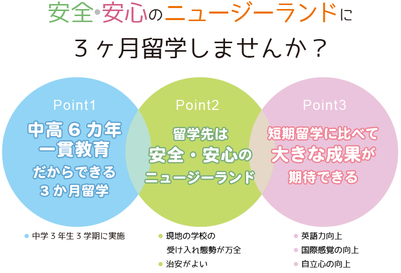 中学3年生の3学期に3カ月間、ニュージーランドへの中期留学が可能です。中高一貫教育により、中学で学ぶ内容は留学前の12月に終わるため安心して参加できます。英語力の向上に期待できるほか、国際感覚や広い視野が身につきます。