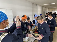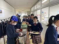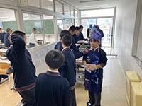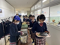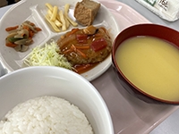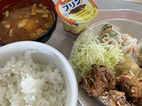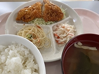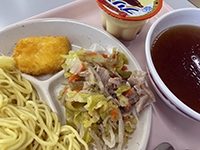 心身の発達に必要不可欠なのが食事です。本校では、調理した給食を提供します。給食は、栄養バランスやカロリーが考慮されたメニューで、みんなで同じ食事を食べて毎日元気に学校生活を送ります。メニューは麺類・丼など、いろいろなバリエーションで対応しています。