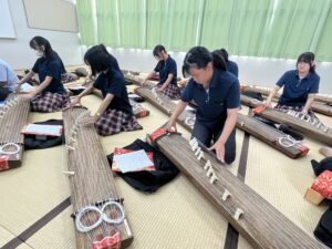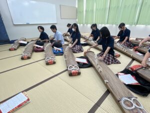 箏の授業は月に1度、生田流師範の野澤佐保子先生に授業をしていただいており、箏の基本的な演奏方法や歴史について教えていただいております。