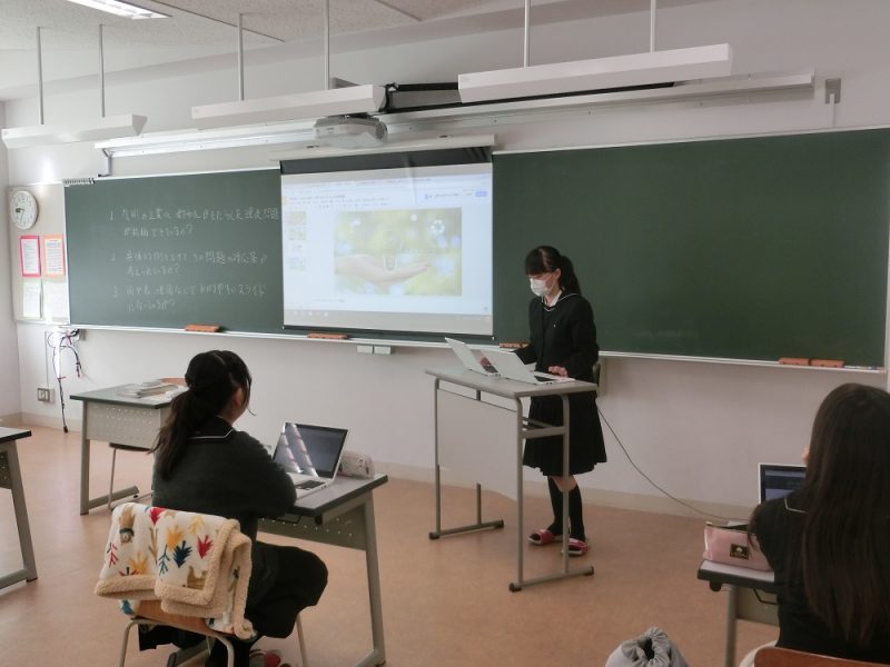 無線LANでプロジェクターにつないだ先生用chromebookで提出されたスライドを生徒たちが発表します。