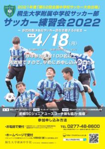 日 時:2022年4月18日(月)18:00~19:30 場 所:桐生大学サッカーグラウンド 対象者:6年生 持ち物:サッカーボール4号、スパイク、室内用シューズ、運動できる服装