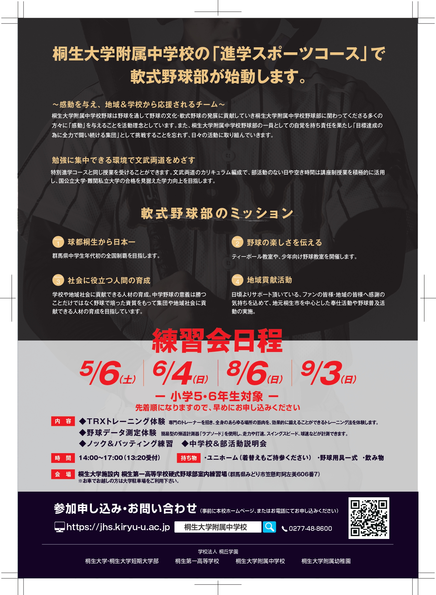 同じ志で・同じ気持ちで・同じ熱量、を持った仲間と『球都桐生から日本一』そして『群馬県中学生年代初の全国制覇』を目指し桐生第一中学校で新たな歴史を作ってみませんか!