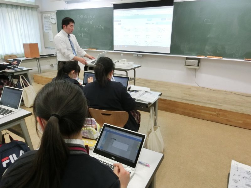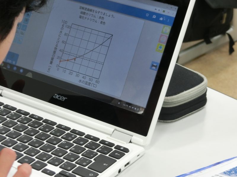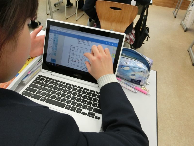 実験をした後に、モバイル端末(chromebook)を使い、先生から配信されたclassinoteに実験結果レポートにまとめました。