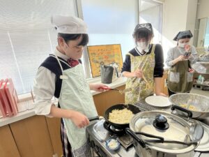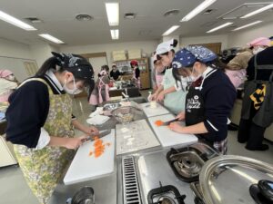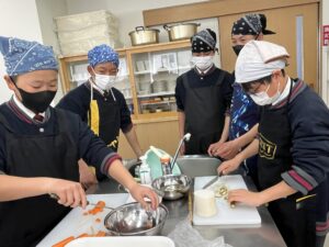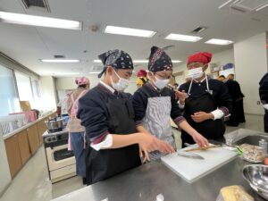 最初はおぼつかない包丁さばきの生徒も、包丁の使い方も丁寧に教えていただいたお陰もあり、上手に食材を切ることができました。