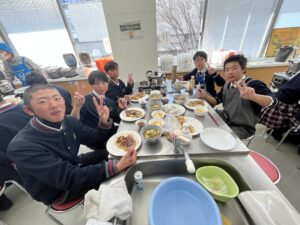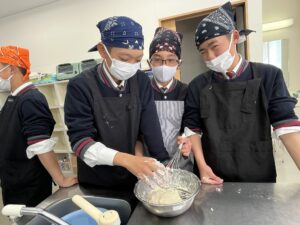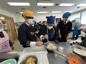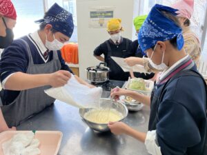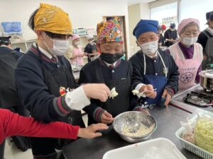 沢山の野菜やきのこを入れて作ったすいとんも、食生活推進委員の方々から、手取り足取りご教授いただきながら、それぞれの班で協力して、個性あふれる一品を完成することができました。